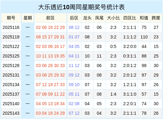 大乐透近十周同星期二奖号统计表