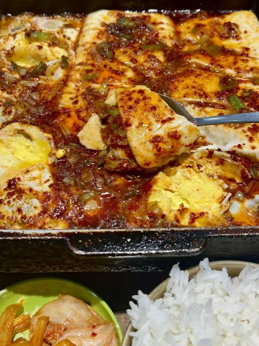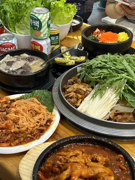 石锅拌饭端上来滋滋作响,锅底锅巴香脆,多种蔬菜搭配秘制辣酱,拌匀后每一口齐裹着食材;辣白菜五花肉拌饭咸辣鲜香,五花肉肥而不腻。